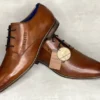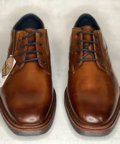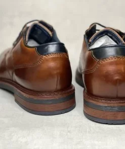 Konjakinruskeat Bugatti pukukengät, joissa aksenttivärinä ripaus tummansinistä. Nauhojen sivuilla on pienet istuvuutta parantavat venykkeet. Tyylikäs kapeneva kärki.