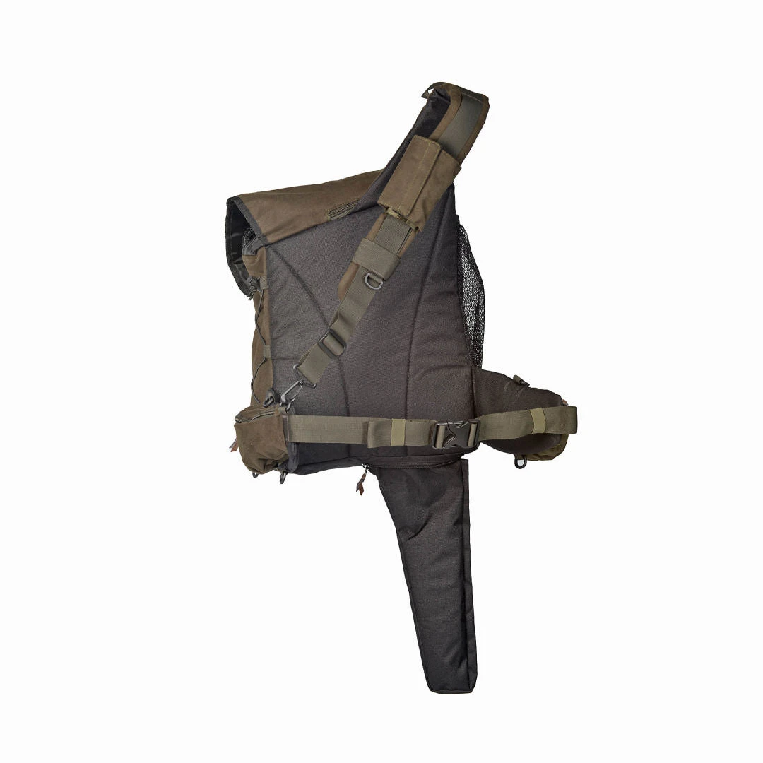Sisäänrakennettu tasku aseelle, josta se on helposti ja nopeasti käyttöönotettavissa. Irrotettava riistapussi, suuri läppä, useita taskuja ja kiinnikkeitä. Materiaalina kahisematon ja pehmeä Velveton, jossa 3-kerros PU-pinnoite. Tukeva olkahihna ja pehmustettu lantiovyö, jossa vetoketjutaskut.             Â