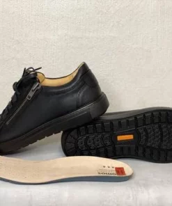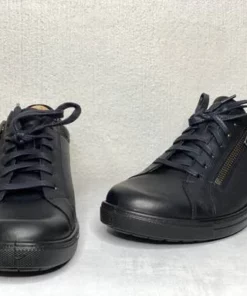 Mustat leveälestiset Jomos kävelykengät. Nahkaiset kävelykengät, joiden ulkosyrjällä pukemista helpottava vetoketju joka toimii myös yksityiskohtana. Nauhojen avulla kenkä on helppos säätää omaan jalkaan sopivaksi. Vaihdettava pohjallinen, jonka tilalle sujahtaa tarvittaessa helposti omaan jalkaasi parhaiten sopiva pohjallinen.