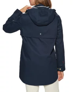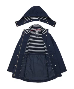 - Full length main zip hidden under a fabric storm flap and snap button fastenings