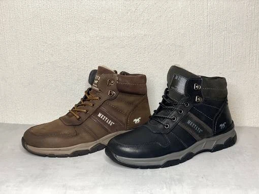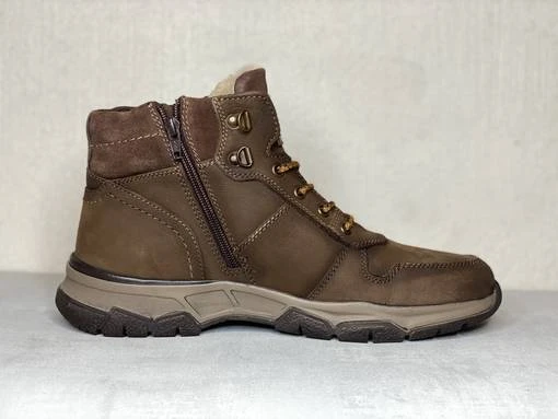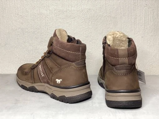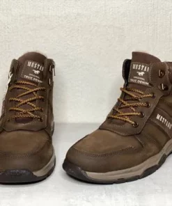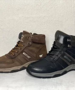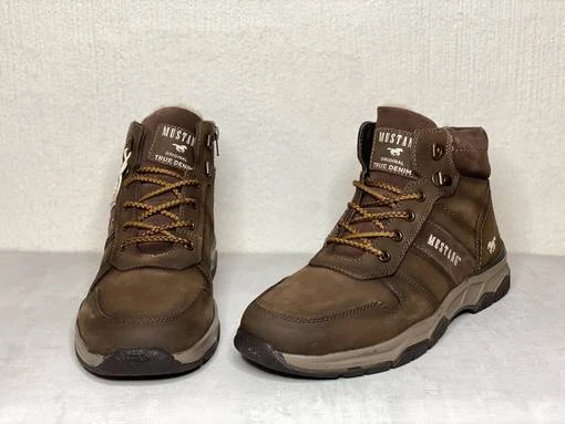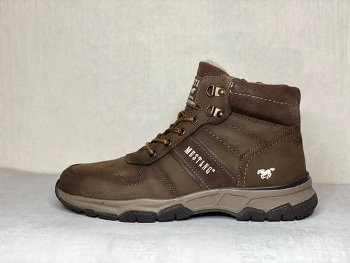 Ruskeat miesten Mustang talvinilkkurit. Ulkosyrjällä ja varressa mokkanahkaiset osiot. Pörröinen sisävuori. Nauhojen avulla kenkä säätyy sujuvasti omaan jalkaan ja sisäsyrjän vetoketju helpottaa pukemista.