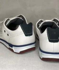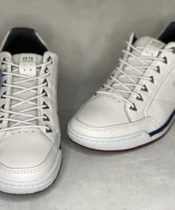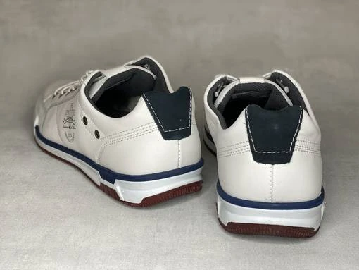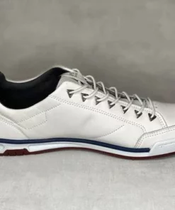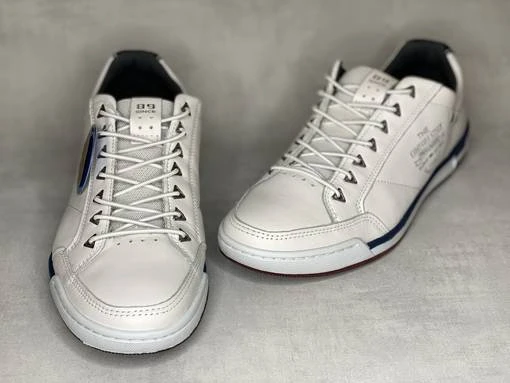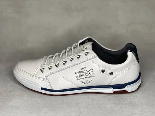 Valkoiset venykenauhaiset miesten Pegada kävelykengät. Punertavan ruskea ulkopohja, valkoiset pohjan sivut joissa tummansininen raita. Venykenauhat kulkevat kolmion mallisten sirkkarenkaisen läpi. Tyylikäs valinta vapaa-aikaan!