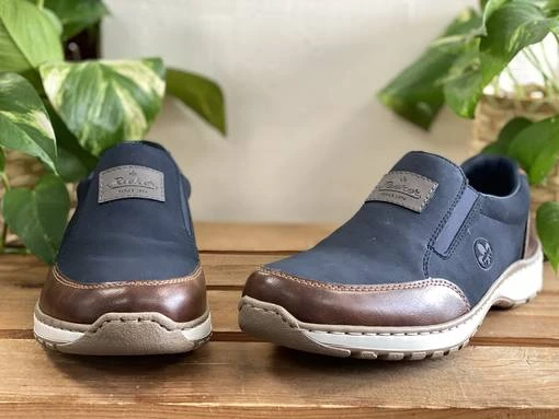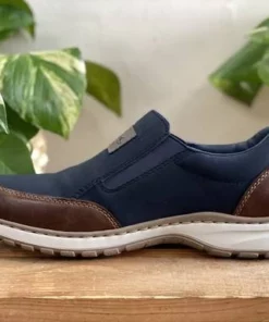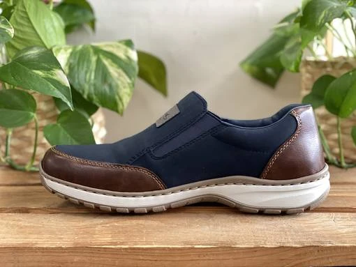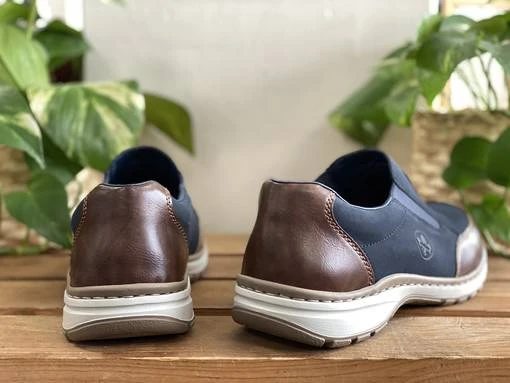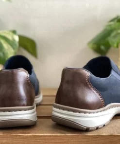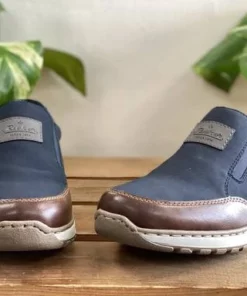 Tummansiniset Rieker kävelykengät, joissa ruskeat yksityiskohdat. Näissä kengissä on leveä lesti ja vaihdettava pohjallinen. Venykkeet helpottavat pukemista ja parantavat istuvuutta.