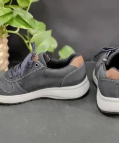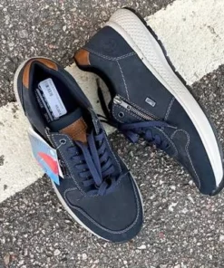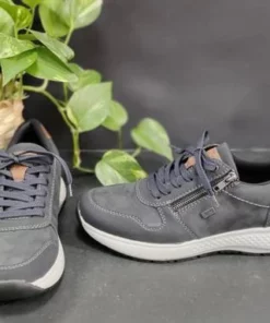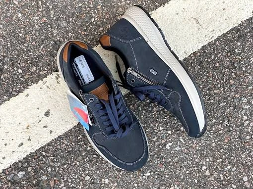 Riekerin tummansinisessä kävelykengässä on ruskeita yksityiskohtia. Kengässä yhdistyvät nauhat ja pukemista helpottava vetoketju. Säädä nauhat kerran ja sujauta kenkä jatkossa jalkaan vetoketjun avulla. Kannan korkeus on noin 3,5cm, edestä noin 2cm.