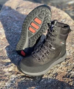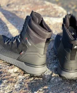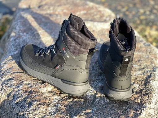 Mustat Rieker Revolution R-Tex kalvolla varustetut talvikengät. Sisäsyrjän vetoketju helpottaa pukemista ja nauhoilla varsikengät saa kiristettyä juuri omaan jalkaan sopiviksi. Irrotettava Thermo foil-lämpöpohjallinen ja villainen vuori pitävät jalat lämpiminä. Kengän pinnassa on kosteudelta suojaava Nano Water -protection pinta. Fiber grip-ulkopohja, eli karheampia osioita, jotka tarjoavas ylimääräistä pitoa liukkaissa talviolosuhteissa.