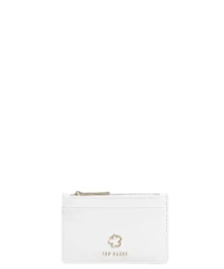 Ted Baker Jorjioa on pieni valkoinen korttikotelo, jota koristaa kaunis logo kuviointi. Korttikotelo mahtuu hyvin taskuun tai pieneen laukkuun. Korttikotelon keskellä on hyvin aukeava vetoketjutasku ja lisäksi takana on korttipaikkoja ja yksi isompi avotasku. Kotelon etupuolella on yksi avotasku. Kotelossa on RFID suojaus.